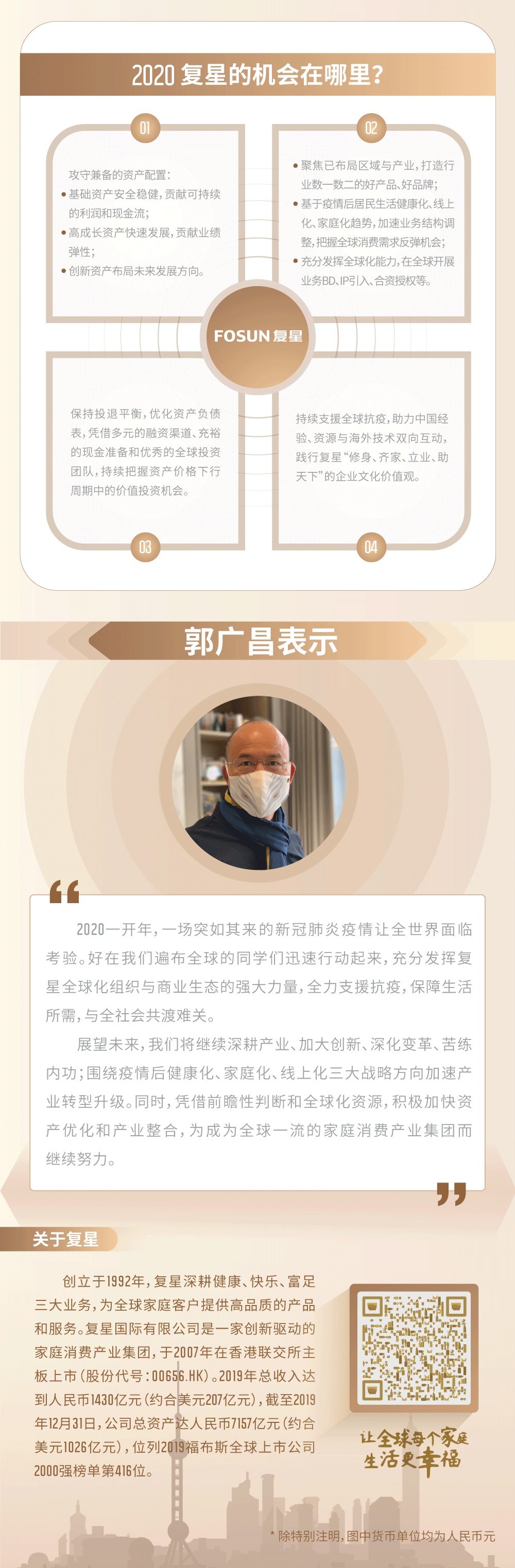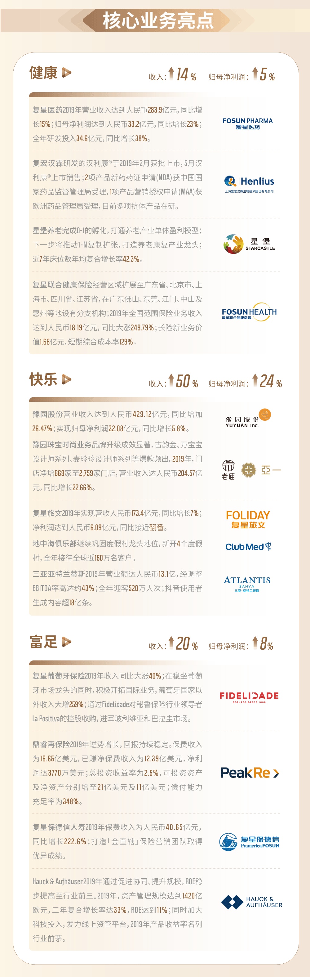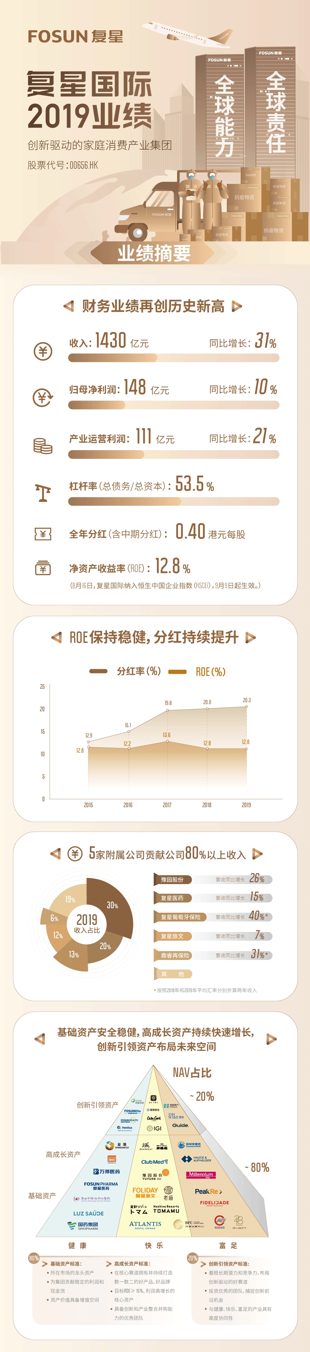 智通财经APP获悉,3月30日,复星国际(00656)公布截至2019年12月31日止年度业绩。期内,公司实现总收入同比增长31%达人民币1429.8亿元;归属于母公司股东利润同比增长10%,连续8年保持增长,再创历史新高,达人民币148.0亿元;董事会建议末期股息为每股港币0.27元;加上中期股息,本年度的股息总额为每股港币0.40元,分红率为20.3%;2015至2019年,每股分红复合增速达24%。以下为复星国际2019年业绩一图:
