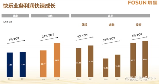 近年来,复星国际将旗下产业划分为三大业务——健康、快乐和富足,在2019年均录得较为不错的增长。排名前五大产业公司收入占比81%,同比平均增速达22%。其中,豫园股份(收入占比30%)同比增长26%,复星医药(收入占比20%)同比增长15%,复星葡萄牙保险(收入占比13%)同比增长40%*,复星旅文(收入占比12%)同比增长7%,以及鼎睿再保险(收入占比6%)同比增长31%*。
