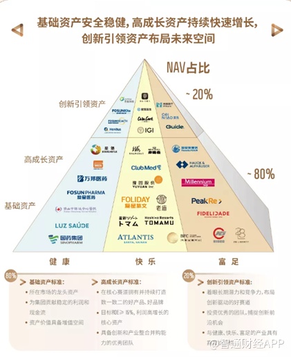 从资产的角度来看,复星的优质资产按类型可以划分为基础资产、高成长资产及创新引领资产三大类,形成一个金字塔形状的组合,其中,基础和高成长资产占到了公司净资产(NAV)总额的约80%。其中基础资产安全稳健,贡献可持续的利润和现金流;高成长资产持续快速发展,贡献业绩弹性。其余NAV占比约20%的资产,则是以复星联合健康保险、杏脉科技、东家、网商银行等企业为主的创新引领资产,它们是复星对未来发展空间的布局。