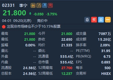 ,较2020年3月31日收市价22.65港元折让约4.99%,所得款项净额将约为14.897亿港元。此外,李宁市前现多宗大手成交,涉及7000万股,或为该配售上板。截至发稿,李宁跌3.75%,报21.8港元,成交额15.28亿港元。