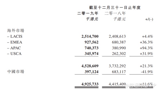 海外市场是百富环球的主要收入来源地,,占集团收入90%以上,也是业绩增长的主要驱动力。2019年,来自海外市场收入创历史新高,达到45.3亿港元,同比增长21.3%。其中核心市场拉丁美洲和独联体国家(LACIS)收入为25.1亿港元,同比稳定增长4.4%;来自亚太区(除中国大陆)(APAC)收入为7.4亿港元,同比增速高达94.3%,收入占比有赶超欧洲、中东及非洲(EMEA)之势。