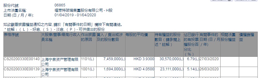 智通财经APP获悉,联交所最新资料显示,3月26日至3月27日,上海宁泉资产管理有限公司分别增持福莱特玻璃(06865)169.4万股及745.9万股,每股作价分别为4.05港元和3.93港元总金额约为3617.45万港元。增持后最新持股数目为3057万股,最新持股比例为6.79%。