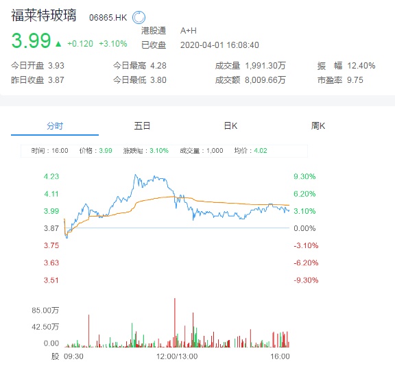 截至今日收盘,福莱特玻璃涨3.1%,报3.99港元。