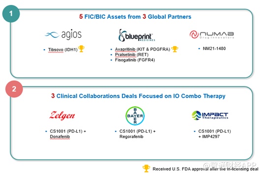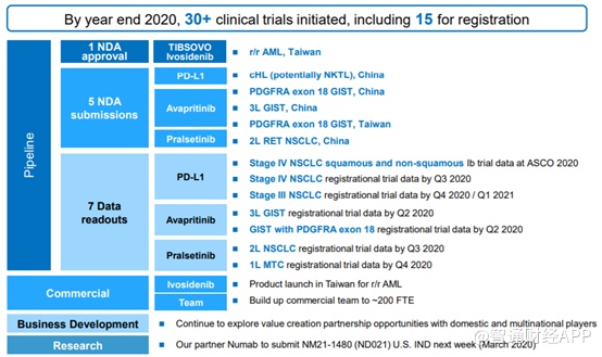 公司获得美国FDA比准上市的两款产品,正是与Agios Pharmaceuticals合作研发的TIBSOVO®(Ivosidenib),以及与Blueprint Medicines合作研发的AYVAKITTM(avapritinib),同时另一款产品pralsetinib(RET)也由Blueprint Medicines启动了美国FDA上市滚动申请,这三款药物均已在中国开展多项注册型实验。2019年,公司就TIBSOVO®(Ivosidenib)在中国台湾提交新药上市申请,适应症为复发难治性急性髓系白血病,预计于2020年获得批准。2020年3月27日,公司向台湾卫生福利部食品药物管理署(TFDA)提交AYVAKITTM(avapritinib)针对PDGFRA外显子18突变胃肠道间质瘤的新药上市申请,该药物已于2020年3月9日获TFDA新药优先审查资格认定。除此之外,公司计划在2020年上半年为AYVAKITTM(avapritinib)针对同一适应症在中国大陆递交新药上市申请。此外,公司预计于2020年在中国大陆提交AYVAKITTM(avapritinib)针对三线胃肠道间质瘤适应症以及pralsetinib(RET)针对二线非小细胞肺癌适应症的上市申请。