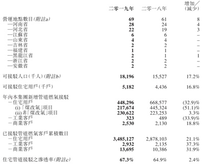 销气业务大幅增长叠加销售自主品牌燃气具及其他增值服务的爆发,中裕燃气营收规模继续向上。智通财经APP了解到,由于“煤改气”项目中的农村地区业务实行公司内部全成本核算要求,考虑农村发展的实际情况带来的后期安全维护成本,以及丘陵地区的地质条件制约,因此公司只挑选符合投资回报率的优质项目,主动放缓了长期看来不稳定且资金风险较高的部分,以维持良好的盈利能力、现金流量及应收账款水平,因此2019在燃气管道建设业务方面营收有所下滑。从数据中可以看到,燃气接驳客户当中,除去年同期增速达300%的44.5万户煤改气住宅用户有所减少外,非煤改气住宅用户和商业用户仍保持稳定的增长。