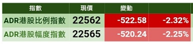 智通财经APP获悉,美股大幅受挫,道指劲泻近千点,拖累港股ADR指数全日疲软,按比例计算,收报22562点,跌522.58点。