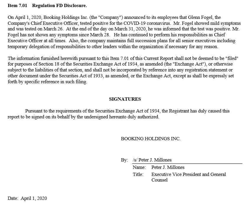 智通财经APP获悉,北京时间4月2日,据在线旅行预订服务公司Booking(BKNG.US)向SEC提交的文件,该公司在当地时间4月1日向其员工宣布,公司CEO格伦·福格尔(Glenn Fogel)的新冠病毒检测呈阳性。