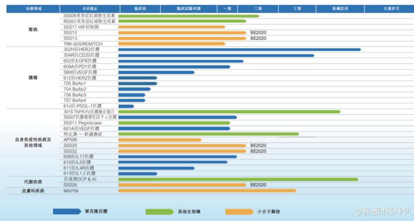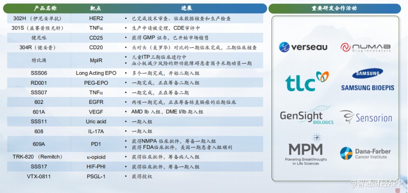 目前公司处于最佳地位的在研生物肿瘤药物产品,包括抗HER2、CD20、PD1、 EGFR和 VEGF等抗体,自身免疫、炎症及其他疾病在研生物药物包括抗TNFa、IL-17A和IL-5抗体等均取得了显著进展。