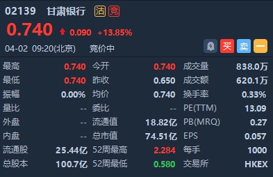 智通财经APP获悉,甘肃银行(02139)发布公告称,该行若干股东已质押的该行H股被强制出售,继而导致该行H股股价及交投量于2020年4月1日有较大幅度波动。该股昨日盘中闪崩收跌43.48%,今日早盘高开,截至发稿,涨13.85%,报0.74港元,成交额620.1万港元。