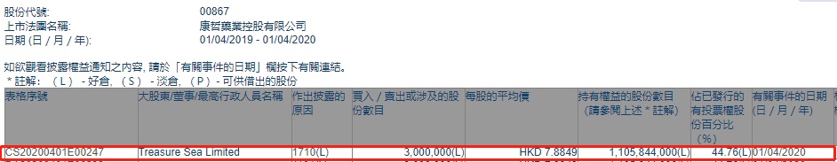 智通财经APP获悉,联交所最新资料显示,4月1日,Treasure Sea Limited增持康哲药业(00867)300万股,每股作价7.8849港元,总金额约为2365.47万港元。增持后最新持股数目约为11.06亿股,最新持股比例为44.76%。