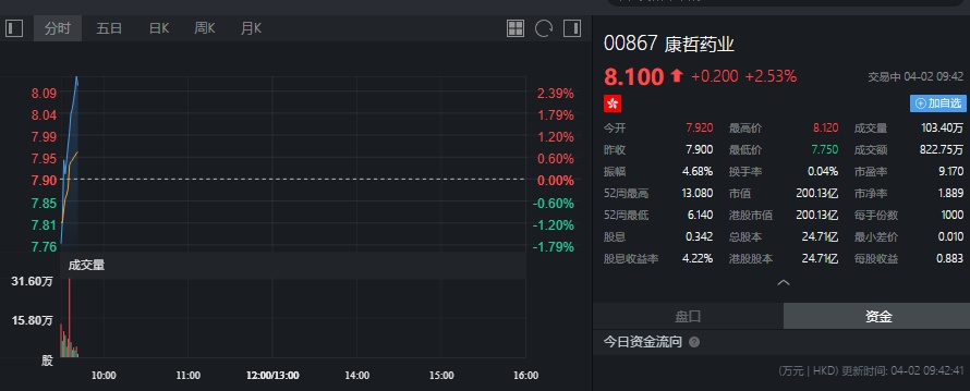 截至发稿,康哲药业涨2.53%,报8.10港元。