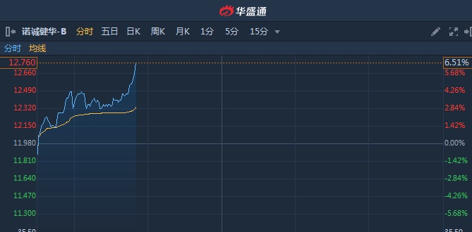 智通财经APP获悉,次新股诺诚健华-B(09969)暂现六连阳,累计涨幅超30%,盘中高见12.78港元,较发售价8.95港元高逾42%,再度刷新历史新高。