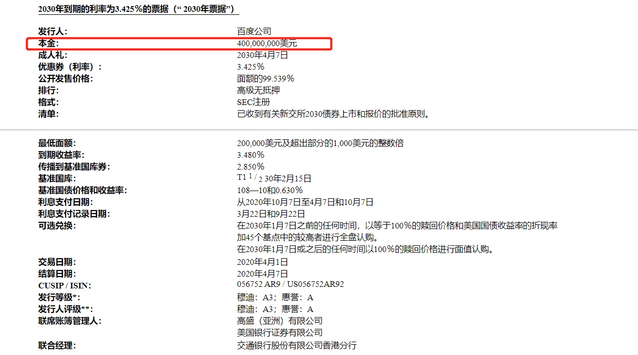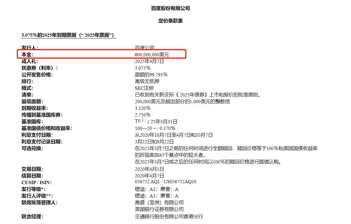 文件显示,百度将发行两张票据,分别为6亿美元和4亿美元,其中6亿美元票据的到期时间为2025年,利率3.075%;4亿美元票据的到期时间为2030年,利率3.425%。此次债券的承销商为高盛与美国银行。对于百度此次发债,评级机构穆迪授予“A3”评级,评级展望为“正面”,惠誉同样给予票据“A”评级。
