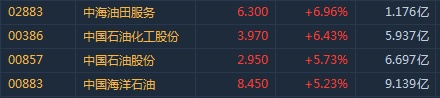 智通财经APP获悉,国际油价午后大幅反弹,港股石油板块涨幅扩大,中石化(00386)暂领涨蓝筹。截至13时51分,中海油田服务(02883)涨6.96%,报价6.3港元,中石化(00386)涨6.43%,中石油(00857)涨5.73%,中海油(00883)涨5.23%。