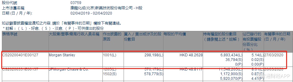 智通财经APP获悉,联交所最新资料显示,3月27日,摩根士丹利增持康龙化成(03759)29.82万股,每股作价48.2628港元,总金额约为1439.20万港元。智通财经APP获悉,增持后最新持股数目约为689.34万股,最新持股比例为5.14%。