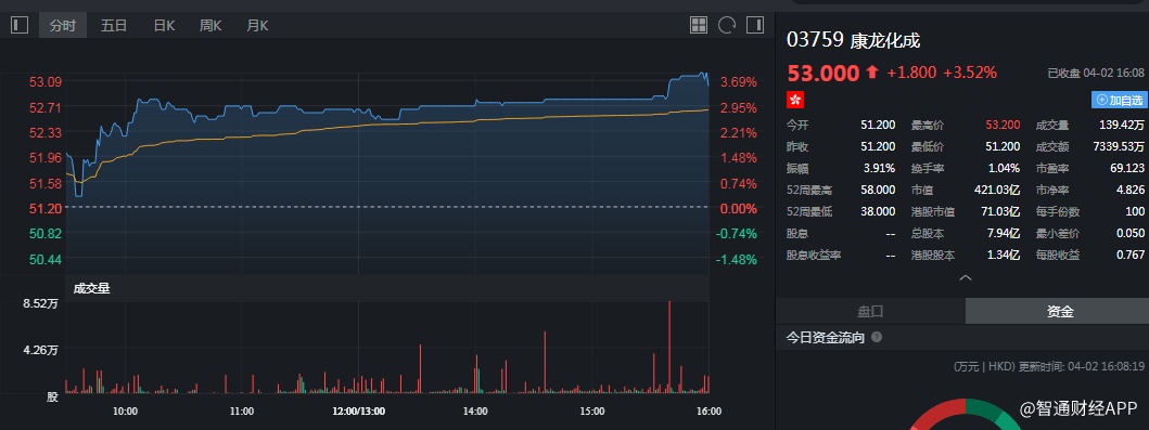 截至今日收盘,康龙化成(03759)涨3.52%,报53.0港元。