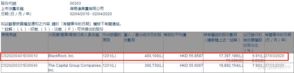 智通财经APP获悉,联交所最新资料显示,3月27日,贝莱德减持伟易达集团(00303)40.01万股,每股作价55.8587港元,总金额约为2234.91万港元。智通财经APP获悉,减持后最新持股数目约为1739.72万股,最新持股比例为6.91%。