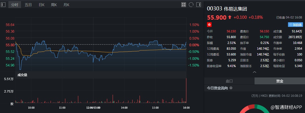 截至今日收盘,伟易达集团(00303)涨0.18%,报55.90港元。