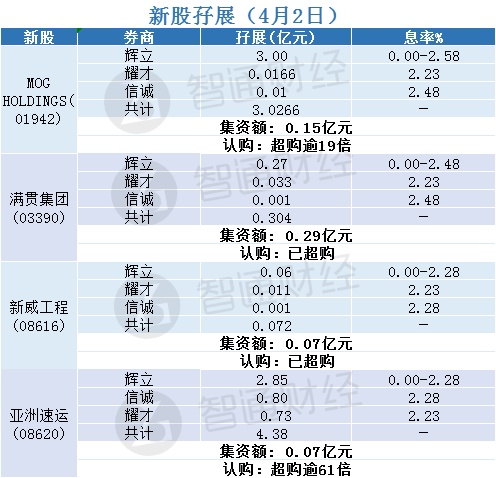 智通财经APP获悉,MOG HOLDINGS(01942)、满贯集团(03390)、亚洲速运(08620)、新威工程(08616)正在招股中,截至4月2日,MOG HOLDINGS超购逾19倍、亚洲速运超购逾61倍,满贯集团、新威工程认购均已超购。
