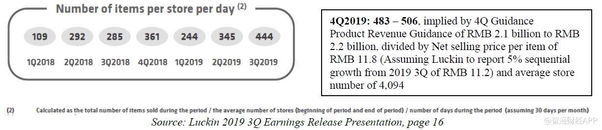 4Q2019: 483 - 506,根据4Q指引,产品收入指引为21亿至22亿元,除以每件产品11.8元的净售价(假设瑞幸从2019年第三季度开始实现5%的环比增长,即11.2元)和平均门店数量4094家。