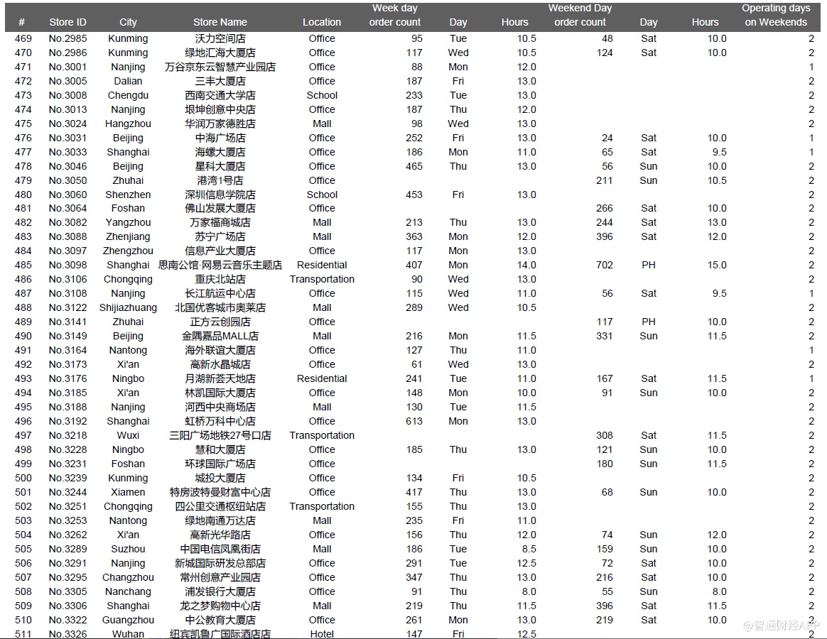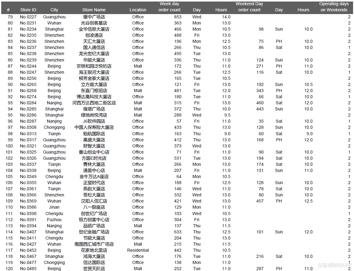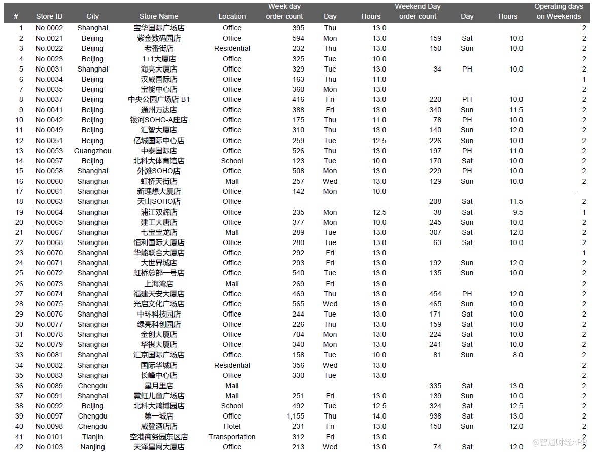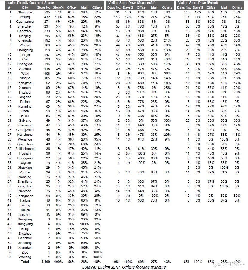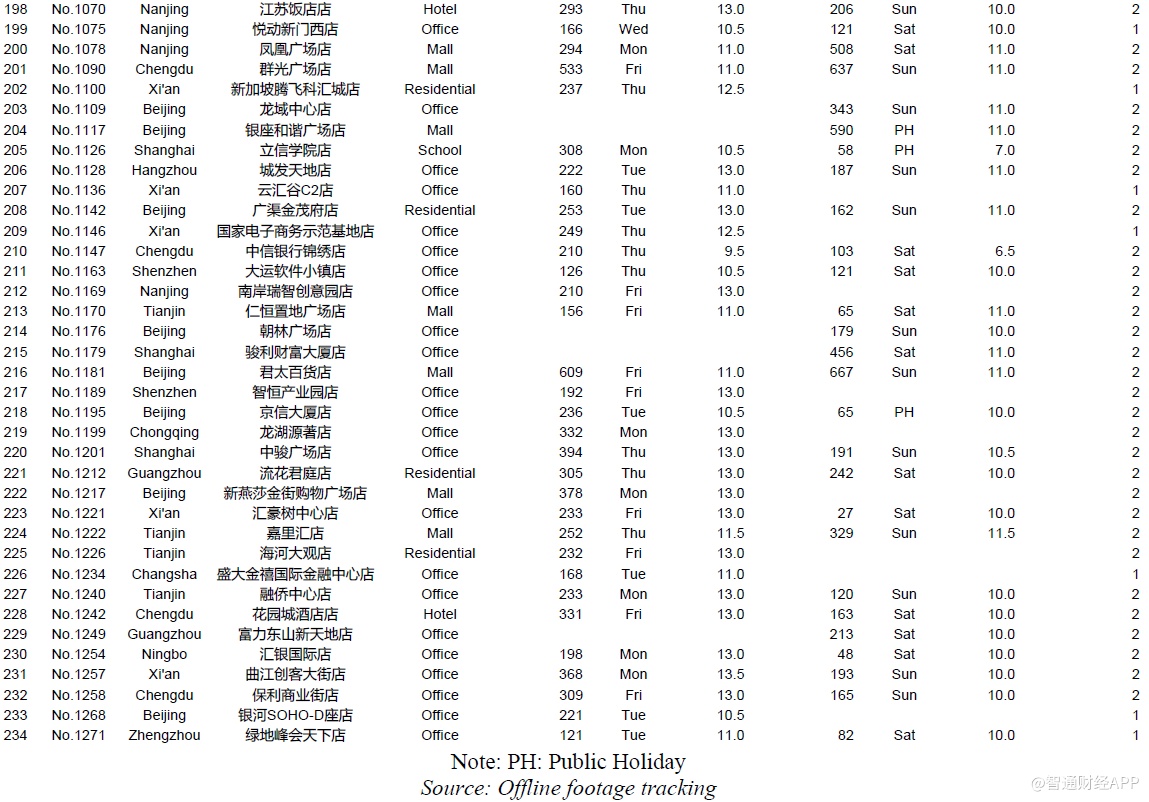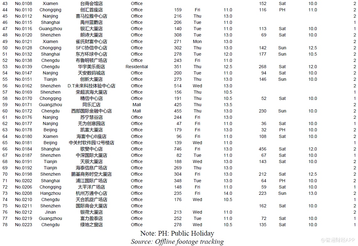 下面是一些城市的位置类型和店龄等对比数据,其中主要信息有:1、瑞幸整体直营门店组合(截至2019年12月31日,我们在瑞幸APP上共找到4409家门店);2、我们成功执行并在数据分析中呈现的981个门店日;3、我们访问了851家店,但是没有记录下一整天的视频,原因包括执行失败——被瑞幸员工赶出来,设备崩溃等等,或者质量控制失败,主要是由于超过10分钟的连续镜头丢失了一整天。执行失败的门店日的数据没有用在数据分析中。