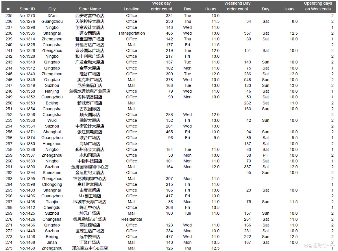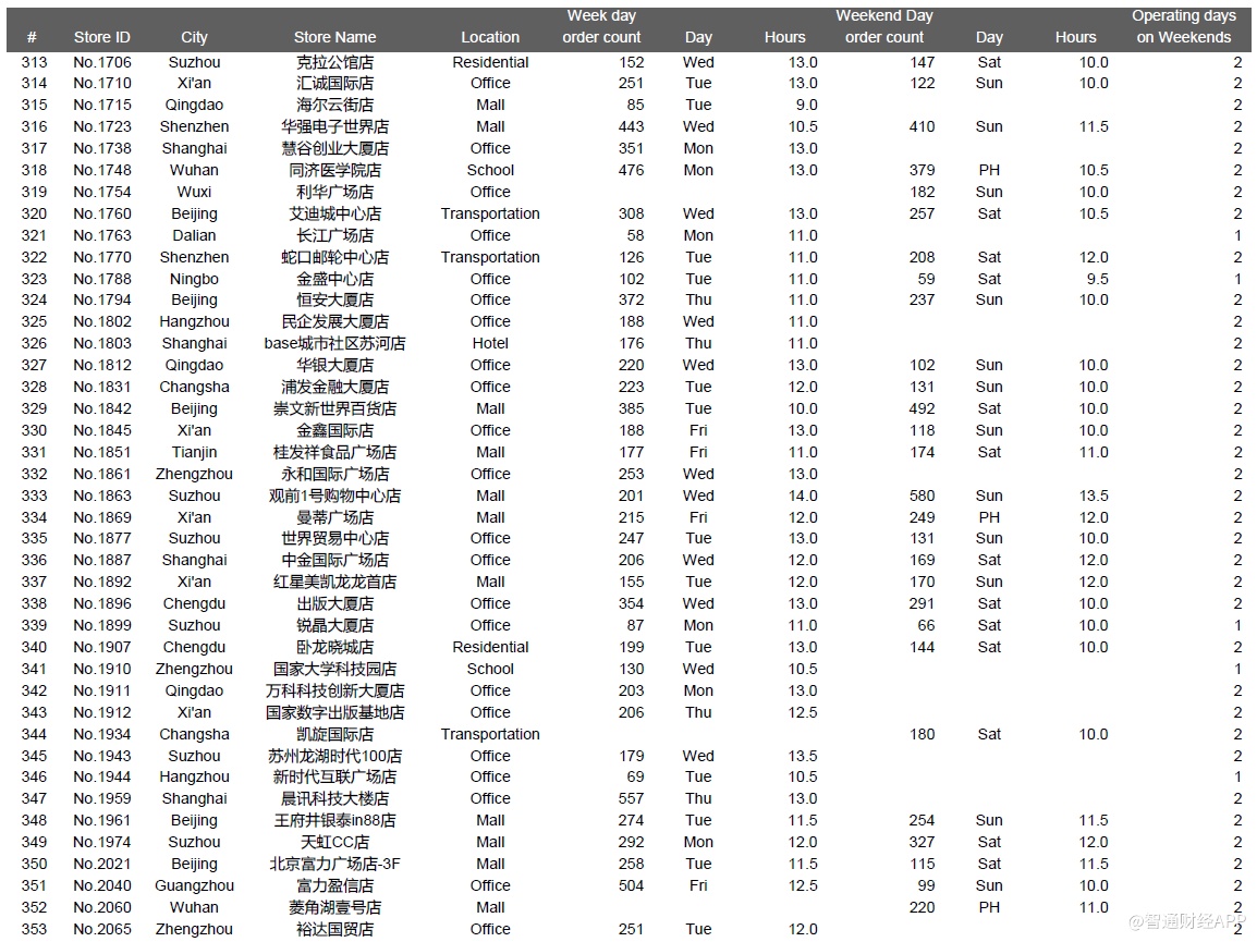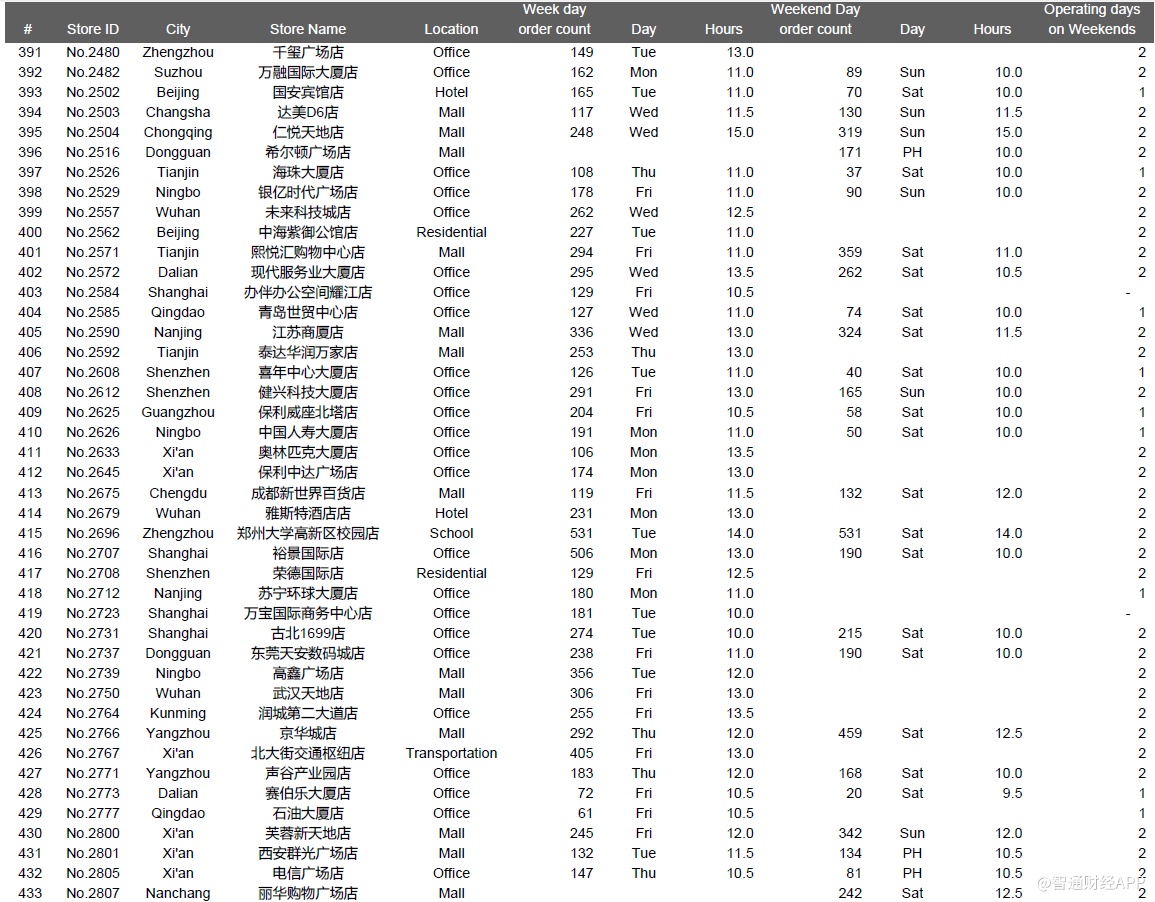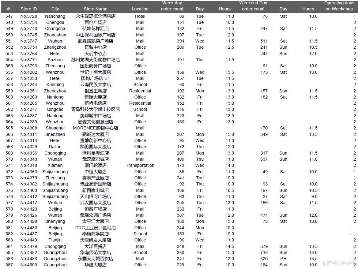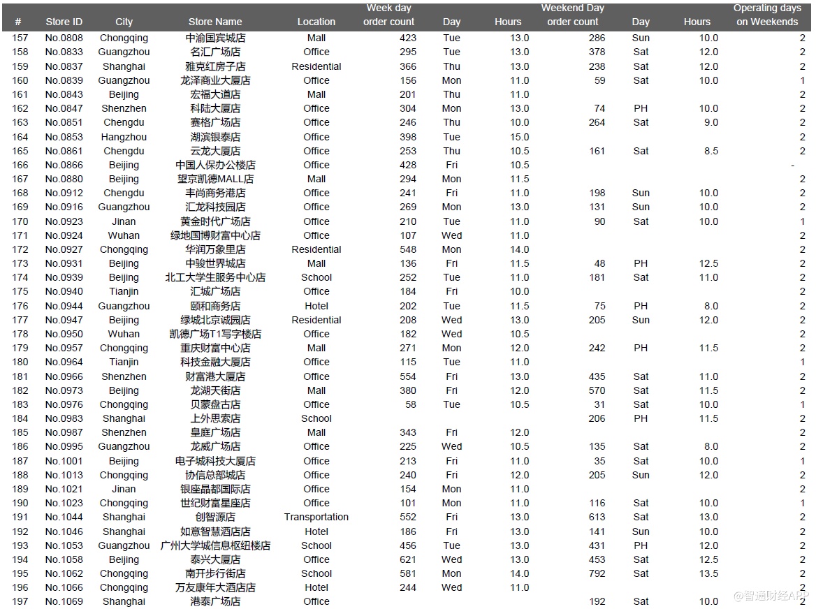 下面是一些城市的位置类型和店龄等对比数据,其中主要信息有:1、瑞幸整体直营门店组合(截至2019年12月31日,我们在瑞幸APP上共找到4409家门店);2、我们成功执行并在数据分析中呈现的981个门店日;3、我们访问了851家店,但是没有记录下一整天的视频,原因包括执行失败——被瑞幸员工赶出来,设备崩溃等等,或者质量控制失败,主要是由于超过10分钟的连续镜头丢失了一整天。执行失败的门店日的数据没有用在数据分析中。