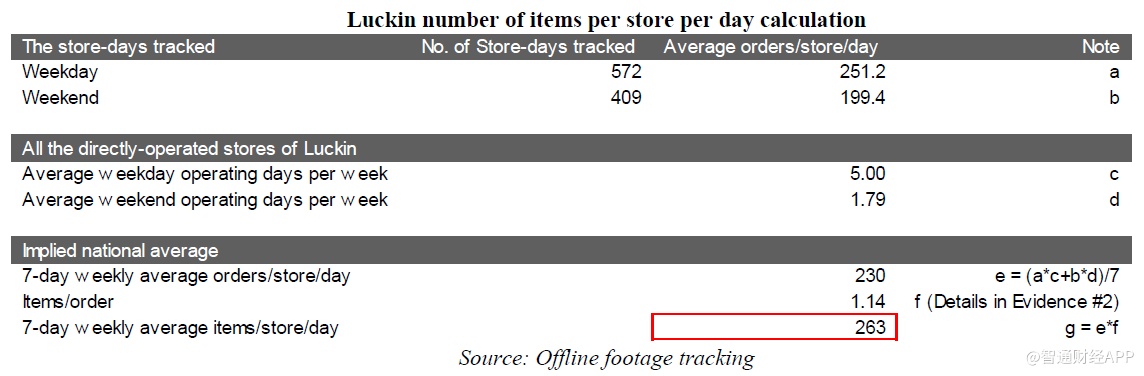 在我们追踪的981个门店日中,我们的员工通常都是坐在门店里,可以直接观察到收款柜台的动向,在记录视频的同时,计算取走瑞幸产品的顾客数量。如果交付订单的是外卖配送人员,我们计算瑞幸纸袋的数量,知道每个人员都可以一次接多个订单(一个订单可以包含多个包,所以我们可能在数量上超过订单的数量)。顾客数量+配送人员取走纸袋的数量的总和可以很好的代表每天每个门店的订单总量。将订单数量乘以每个订单1.14的商品数量,就得到了要验证的关键指标——每个门店每天的商品销量。