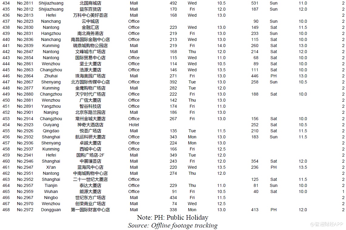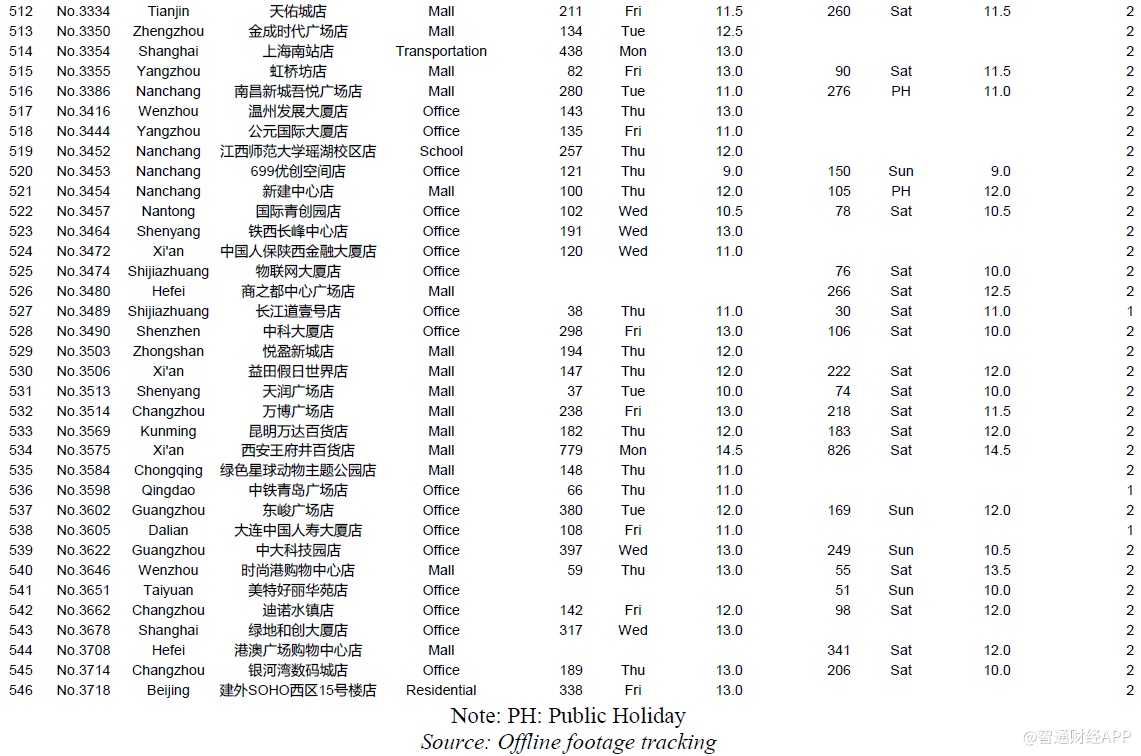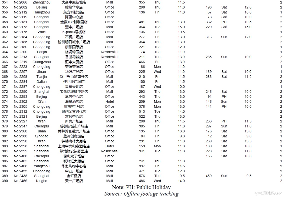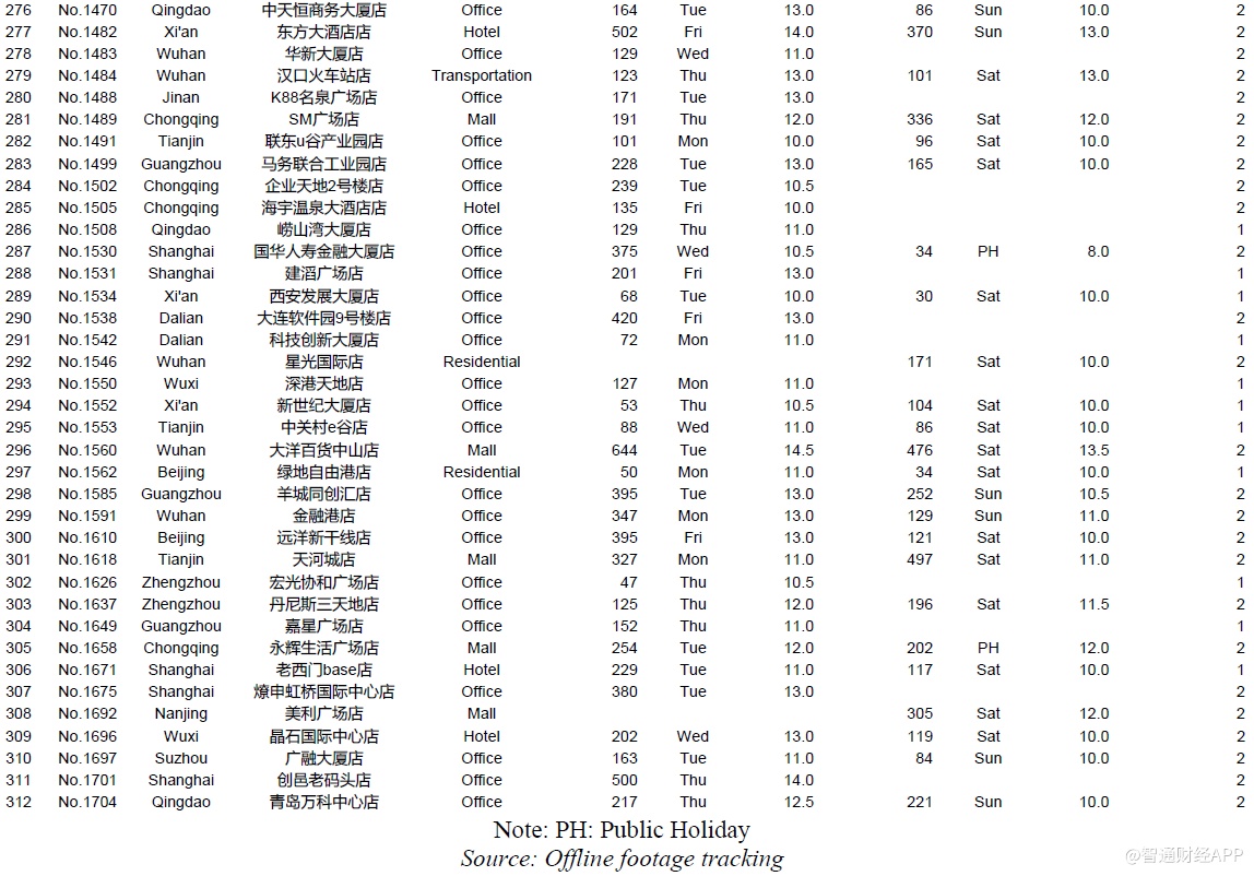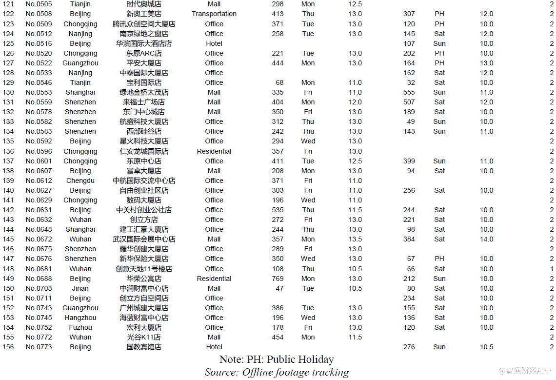 我们动员了92名全职和1418名兼职人员在现场进行监控,成功记录了981个门店日的客流量,覆盖了620家门店100%的营业时间。门店选择方法基于城市和地点类型的分布,与瑞幸的4507家直营店预计2019年底开业的情况相同。瑞幸的4507家门店分布在53个城市,我们覆盖了38个城市,其中96%的门店都位于这些城市。通过分析瑞幸店铺的详细地址来确定店铺的位置类型:我们将门店分为办公室、商场、学校、住宅、交通、酒店等。