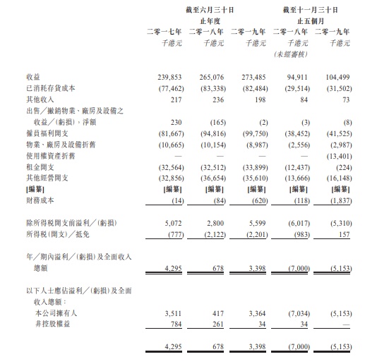 截至2017年、2018年及2019年6月30日止年度以及截至2019年11月30日止五个月,该企业收益分别为约2.40亿港元、2.65亿港元及2.73亿港元及1.04亿港元。绝大部分收益来自香港酒家的食品以及饮料销售。企业也从食品加工和贸易赚取收益。于往绩记录期间,集团大部分收益以现金或信用卡结算。