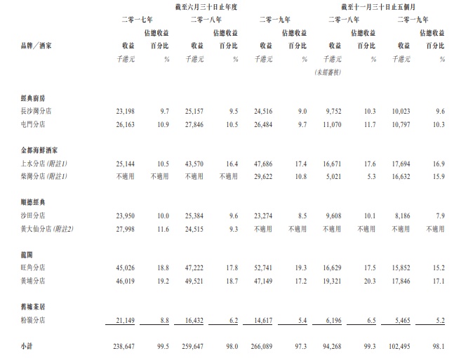 于往绩记录期间,酒家营运贡献大部分收益,分别占截至2017年、2018年及2019年6月30日止年度以及截至2019年11月30日止五个月总收益的约 99.5%、98.0%、97.3%及98.1%。