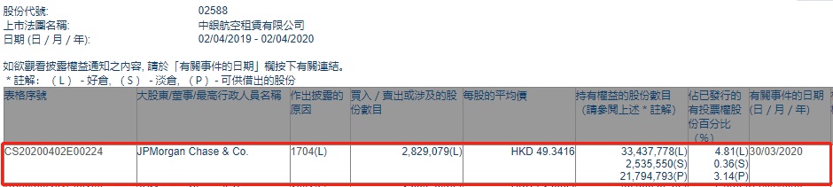 智通财经APP获悉,联交所最新资料显示,3月30日,摩根大通减持中银航空租赁(02588)282.9079万股,每股作价49.3416港元,总金额约为1.40亿港元。减持后最新持股数目约为3343.78万股,最新持股比例为4.81%。
