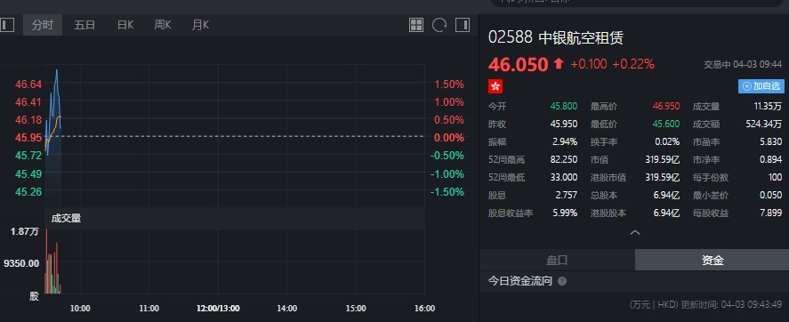 截至发稿,中银航空租赁涨0.22%,报46.05港元。