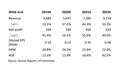 其他业务方面,尽管在线P2P借贷平台急剧下降,但其“行业解决方案”(IS)的结算金额小幅反弹,同比增长3.0%。同时,汇付天下也在积极发展业务多远化以及涉足至其他行业,比如保险、航空和旅游服务,以及物流和供应链。鉴于与SaaS提供商的紧密合作,以及CBI在新产业领域的多元化和巨大的商业机会,海通预计在FY20-22财年,汇付的结算总额的年复合增长率将达到32%。