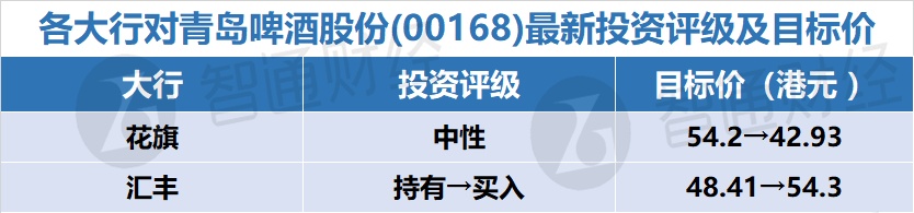 三、各大行对青岛啤酒股份(00168)最新投资评级及目标价