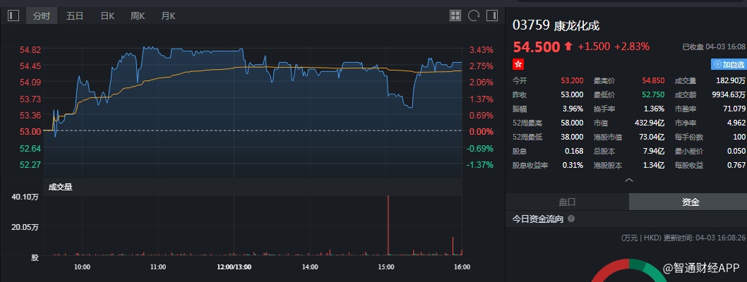 截至今日收盘,康龙化成(03759)涨2.83%,报54.50港元。
