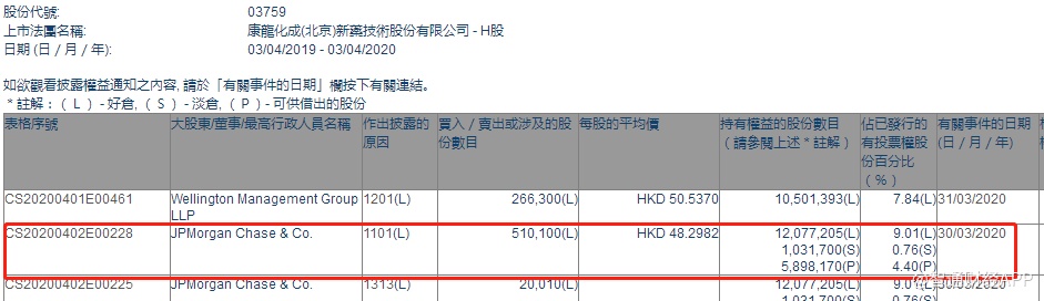 智通财经APP获悉,联交所最新资料显示,3月30日,摩根大通增持康龙化成(03759)51.01万股,每股作价48.2982港元,总金额约为2463.69万港元。智通财经APP获悉,增持后最新持股数目约为1207.72万股,最新持股比例为9.01%。