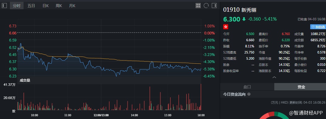截至今日收盘,新秀丽(01910)跌5.41%,报6.30港元。