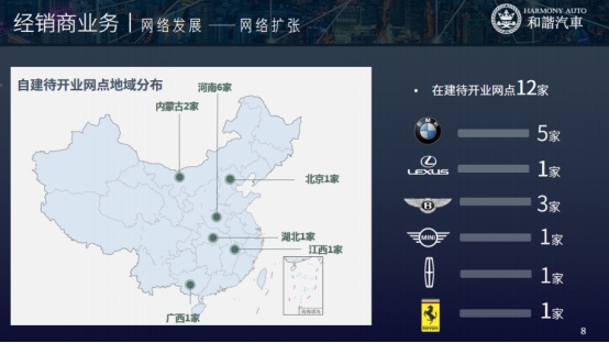 为巩固和提升现有市场地位,和谐汽车积极布局中西部市场和新一线城市。截至2020年3月29日,和谐汽车已获授权及待建的共5个品牌,12家店面,分布于河南、江西、内蒙古等省份的中心城市。