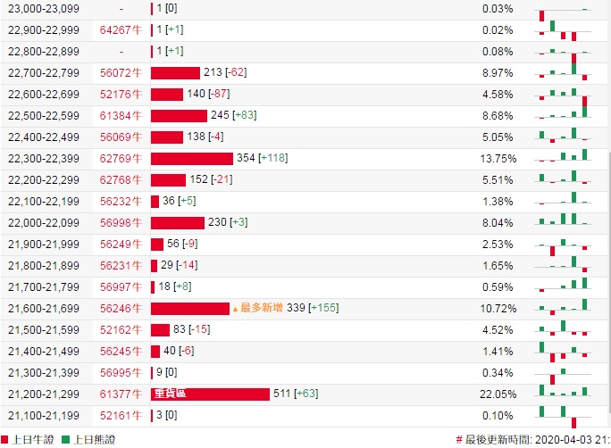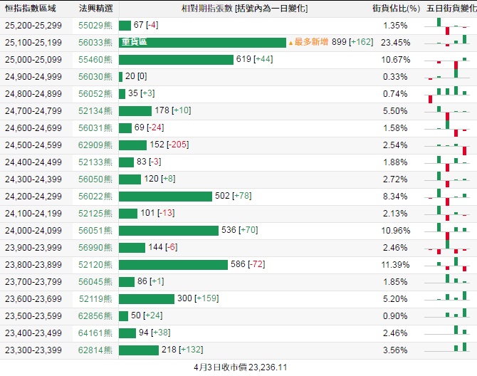 智通财经APP获悉,截至4月3日,恒指最新的牛熊街货比例29.2:70.8。法兴恒指牛熊证街货分布图中的数据显示,熊证街货重货区在25100-25199区间,该区间最新熊证数量为899张,较上一交易日增加162张,最多新增也在这一区间。牛证街货重货区在21200-21299区间,该区间最新牛证数量为339张,较上一交易日增加63张,最多新增在21600-21699区间,该区间最新牛证数量为339张,较上一交易日增加155张。