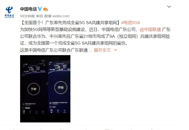根据中国电信(00728)官方微博的消息,中国电信广东公司、中国联通广东公司联合华为、中兴(00763)率先在广东省21地市完成了SA(独立组网)共建共享组网验证,广东成为全国第一个完成全省5G SA共建共享组网的省份。