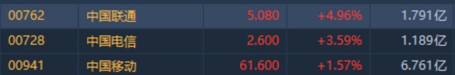 智通财经APP获悉,三大运营商早盘延续涨势,中国联通(00762)涨近5%,截至10时54分,中国联通(00762)涨4.96%,报价5.08港元,中国电信(00728)涨3.59%,中国移动(00941)涨1.57%。