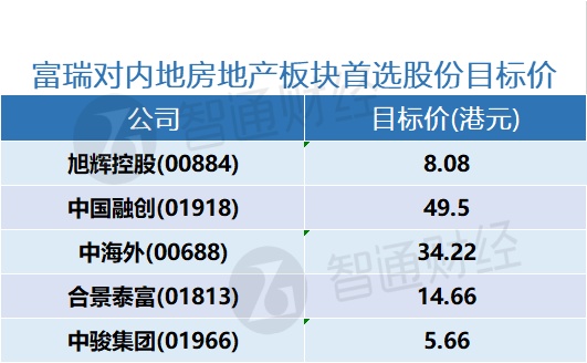 智通财经APP获悉,富瑞发表行业报告称,内房股去年业绩大致理想及负债率较低,随着行业销售和现金流改善及有更多宽松政策推出,建议投资者应持续增持内房股,当中预计中型市值房企今年销售及利润将增长20-30%,继续跑赢行业,首选为旭辉控股集团(00884)、融创中国(01918)、中国海外发展(00688)、合景泰富(01813)及中骏集团(01966)。