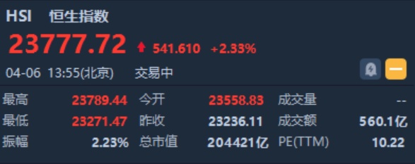 截至13时55分,恒指涨541.61点或2.33%,报23777.72点,成交额560.1亿。