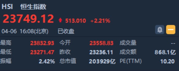智通财经APP获悉,恒指早盘高开322.72点或1.39%,报23558.83点。截至收盘,恒生指数涨513.01点或2.21%,报23749.12点,全日成交额达868.14亿。国企指数涨1.7%,报9652.31点,红筹指数涨2.1%,报3683.35点。