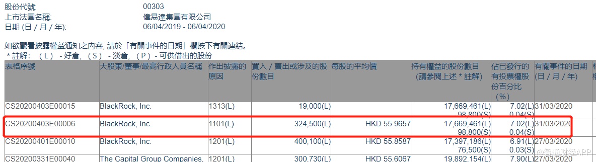 智通财经APP获悉,联交所最新资料显示,3月31日,贝莱德增持伟易达集团(00303)32.45万股,每股作价55.9657港元,总金额约为1816.09万港元。智通财经APP获悉,增持后最新持股数目约为1766.95万股,最新持股比例为7.02%。