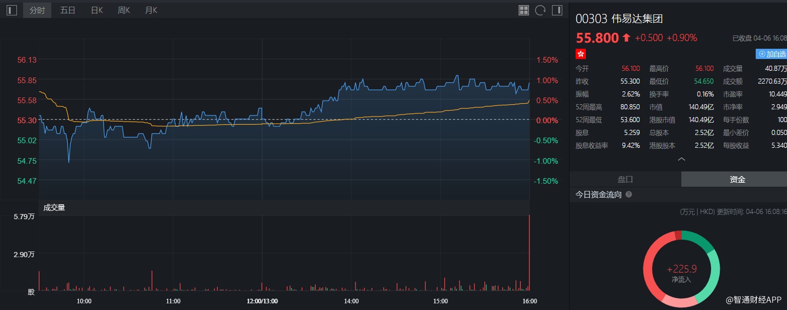 截至今日收盘,伟易达集团(00303)涨0.90%,报55.80港元。