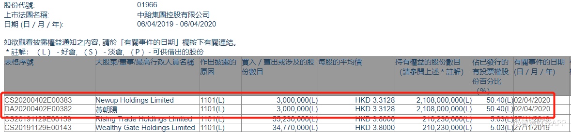 智通财经APP获悉,联交所最新资料显示,4月2日,主席黄朝阳增持中骏集团控股(01966)300万股,每股作价3.3128港元,总金额为993.84万港元。智通财经APP获悉,增持后最新持股数目为21.08亿股,最新持股比例为50.4%。