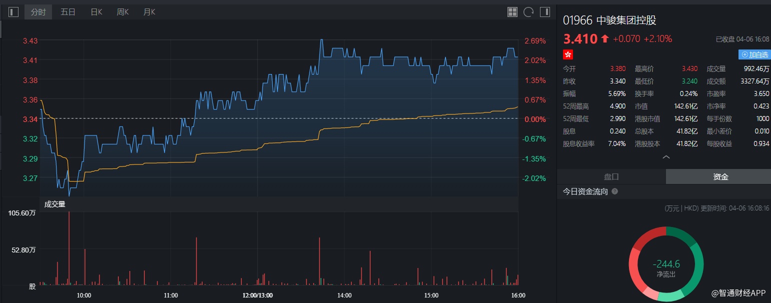 截至今日收盘,中骏集团控股(01966)涨2.10%,报3.41港元。