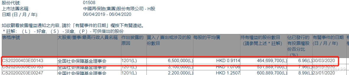 智通财经APP获悉,联交所最新资料显示,3月30日,全国社会保障基金理事会减持中国再保险(01508)650万股,每股作价0.9114港元,总金额为592.41万港元。智通财经APP获悉,减持后最新持股数目约为4.65亿股,最新持股比例为6.96%。