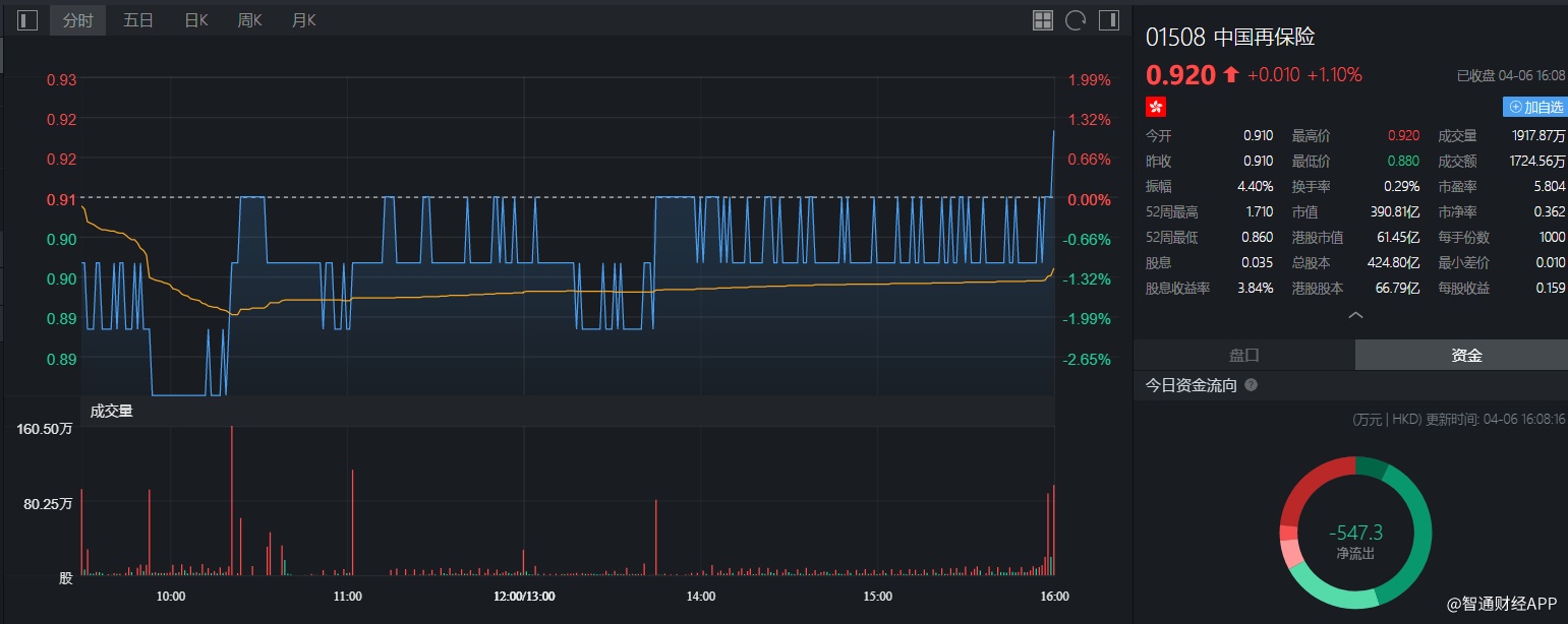截至今日收盘,中国再保险(01508)涨1.10%,报0.92港元。